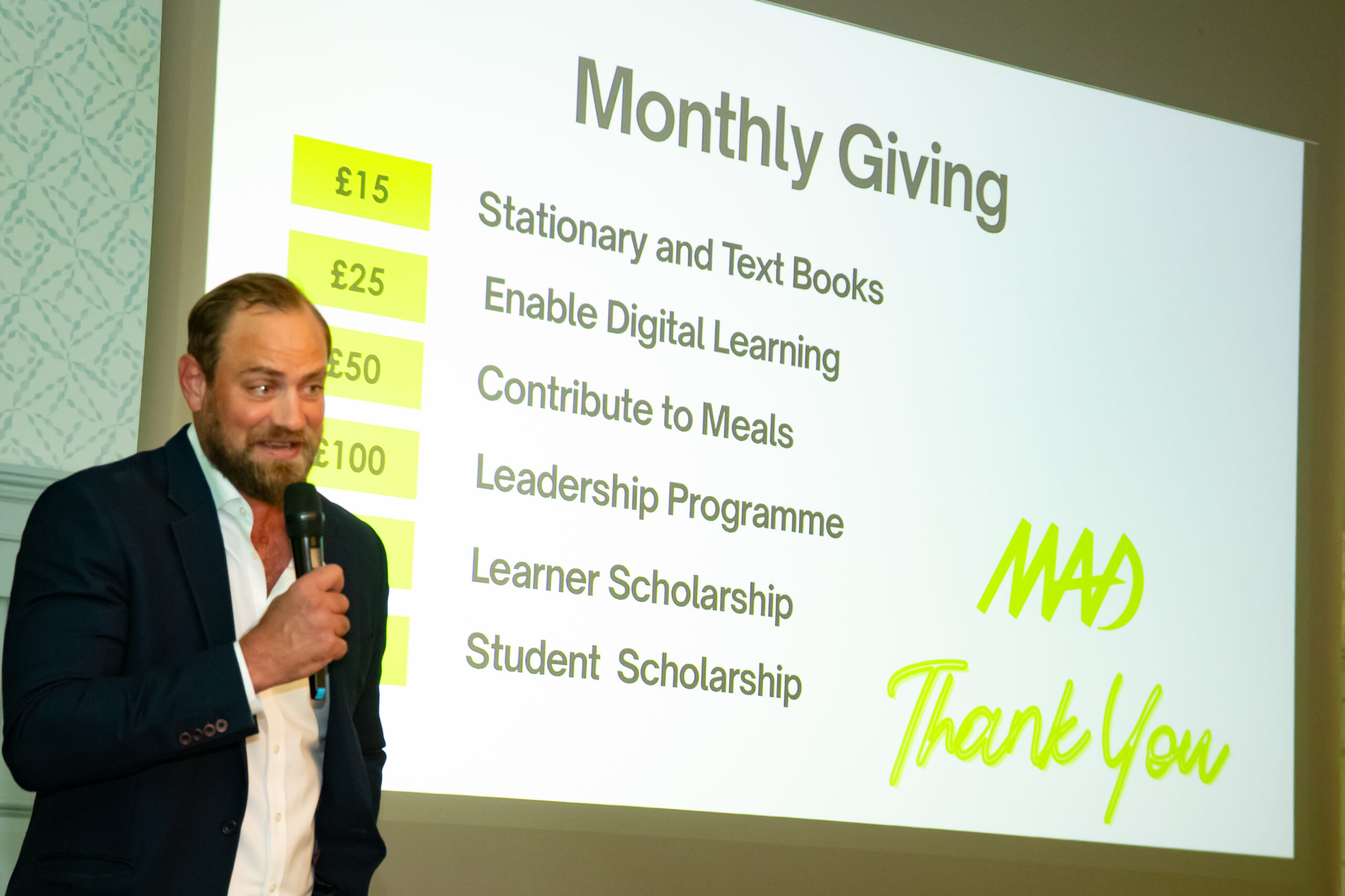 This was followed by the banquet dinner in the Balmoral Banquet Suite at Pennyhill Park Hotel & Spa. Our MC, Alistair Hargreaves, greeted the guests and smoothly guided them through the evening’s events. He introduced MAD Alumnus Claudia Masemola, who delivered a heartfelt and inspiring speech. Claudia’s words were a powerful tribute to MAD, assuring the guests they had chosen the perfect place to Make A Difference.
